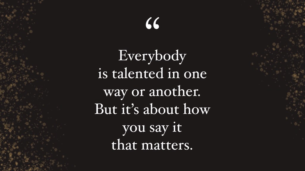 It’s how you say it that matters On April 24, 2021 By AmandaIn Quotes It’s how you say it quote “Everybody is talented in one way or another. But it’s about ow you say it that matters.” Share this: Click to share on X (Opens in new window) X Click to share on Facebook (Opens in new window) Facebook More Click to print (Opens in new window) Print Click to share on LinkedIn (Opens in new window) LinkedIn Click to share on Tumblr (Opens in new window) Tumblr Click to share on Pinterest (Opens in new window) Pinterest Click to share on Pocket (Opens in new window) Pocket Like Loading... Related