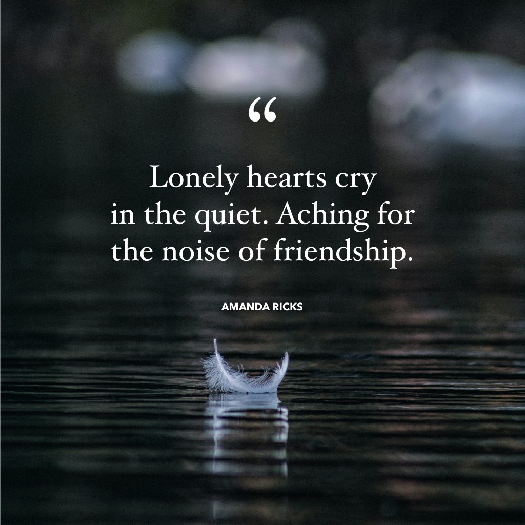 Lonely hearts On July 15, 2021 By AmandaIn Quotes “Lonely hearts cry in the quiet. Aching for the noise of friendship,” – Amanda Ricks Share this: Click to share on X (Opens in new window) X Click to share on Facebook (Opens in new window) Facebook More Click to print (Opens in new window) Print Click to share on LinkedIn (Opens in new window) LinkedIn Click to share on Tumblr (Opens in new window) Tumblr Click to share on Pinterest (Opens in new window) Pinterest Click to share on Pocket (Opens in new window) Pocket Like Loading... Related