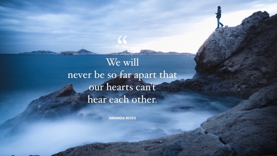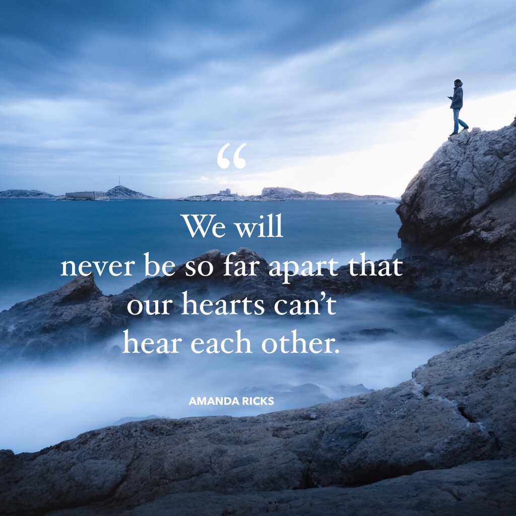 Never too far On July 31, 2021 By AmandaIn Quotes “We will never be so far apart that our hearts can’t hear each other.” – Amanda Ricks Share this: Click to share on X (Opens in new window) X Click to share on Facebook (Opens in new window) Facebook More Click to print (Opens in new window) Print Click to share on LinkedIn (Opens in new window) LinkedIn Click to share on Tumblr (Opens in new window) Tumblr Click to share on Pinterest (Opens in new window) Pinterest Click to share on Pocket (Opens in new window) Pocket Like Loading... Related