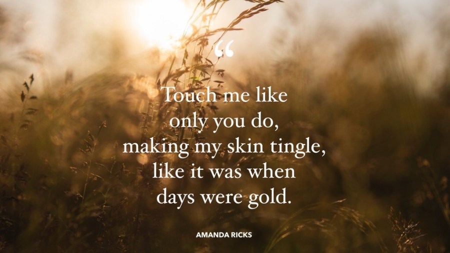 Touch me like only you do On August 5, 2021 By AmandaIn Quotes “Touch me like only you do, making my skin tingle, like it was when days were gold.” – Amanda Ricks Share this: Click to share on X (Opens in new window) X Click to share on Facebook (Opens in new window) Facebook More Click to print (Opens in new window) Print Click to share on LinkedIn (Opens in new window) LinkedIn Click to share on Tumblr (Opens in new window) Tumblr Click to share on Pinterest (Opens in new window) Pinterest Click to share on Pocket (Opens in new window) Pocket Like Loading... Related