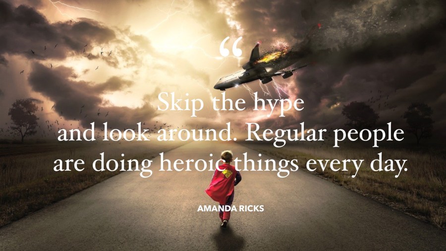 No hype heroes On August 13, 2021 By AmandaIn Quotes “Skip the hype and look around. Regular people are doing heroic things every day.” -Amanda Ricks Share this: Click to share on X (Opens in new window) X Click to share on Facebook (Opens in new window) Facebook More Click to print (Opens in new window) Print Click to share on LinkedIn (Opens in new window) LinkedIn Click to share on Tumblr (Opens in new window) Tumblr Click to share on Pinterest (Opens in new window) Pinterest Click to share on Pocket (Opens in new window) Pocket Like Loading... Related