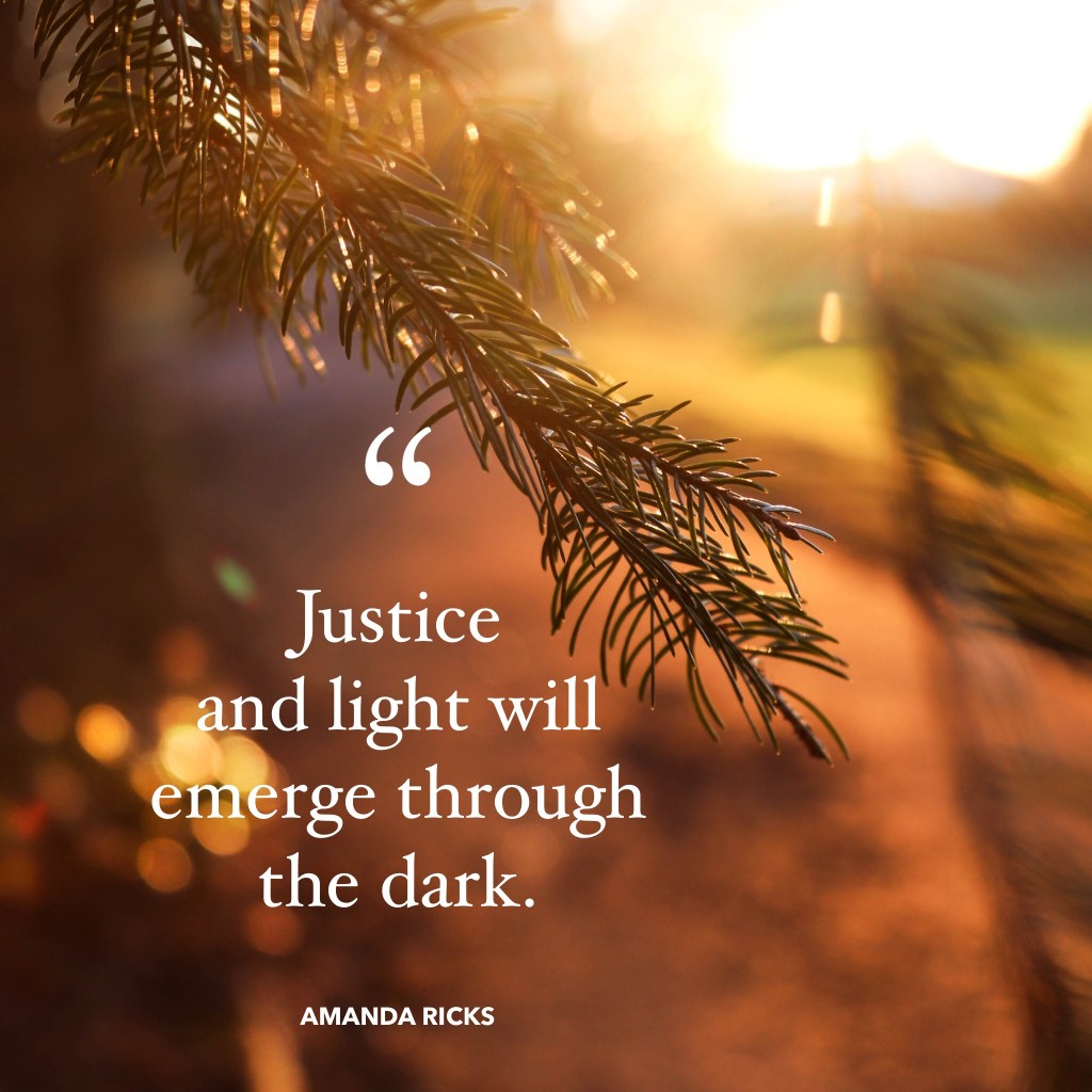 Justice emerges On August 19, 2021 By AmandaIn Quotes “Justice and light will emerge through the dark.” – Amanda Ricks Share this: Click to share on X (Opens in new window) X Click to share on Facebook (Opens in new window) Facebook More Click to print (Opens in new window) Print Click to share on LinkedIn (Opens in new window) LinkedIn Click to share on Tumblr (Opens in new window) Tumblr Click to share on Pinterest (Opens in new window) Pinterest Click to share on Pocket (Opens in new window) Pocket Like Loading... Related