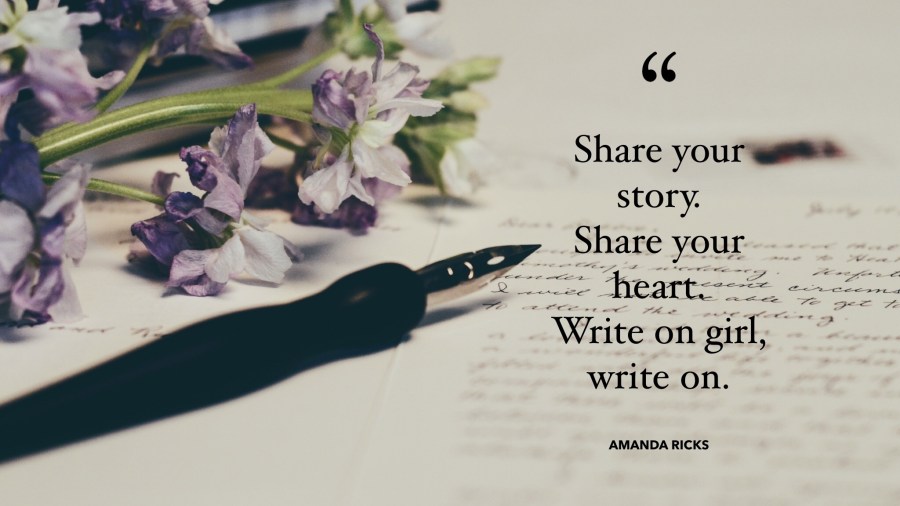 Write on girl On August 20, 2021August 20, 2021 By AmandaIn Quotes “Share your story. Share your heart. Write on girl, write on. – Amanda Ricks Share this: Click to share on X (Opens in new window) X Click to share on Facebook (Opens in new window) Facebook More Click to print (Opens in new window) Print Click to share on LinkedIn (Opens in new window) LinkedIn Click to share on Tumblr (Opens in new window) Tumblr Click to share on Pinterest (Opens in new window) Pinterest Click to share on Pocket (Opens in new window) Pocket Like Loading... Related