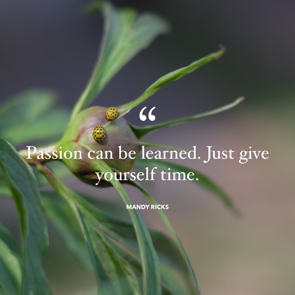 Passion On October 7, 2021October 31, 2021 By AmandaIn Quotes Passion can be learned. Just give yourself time. – Mandy Ricks Share this: Click to share on X (Opens in new window) X Click to share on Facebook (Opens in new window) Facebook More Click to print (Opens in new window) Print Click to share on LinkedIn (Opens in new window) LinkedIn Click to share on Tumblr (Opens in new window) Tumblr Click to share on Pinterest (Opens in new window) Pinterest Click to share on Pocket (Opens in new window) Pocket Like Loading... Related