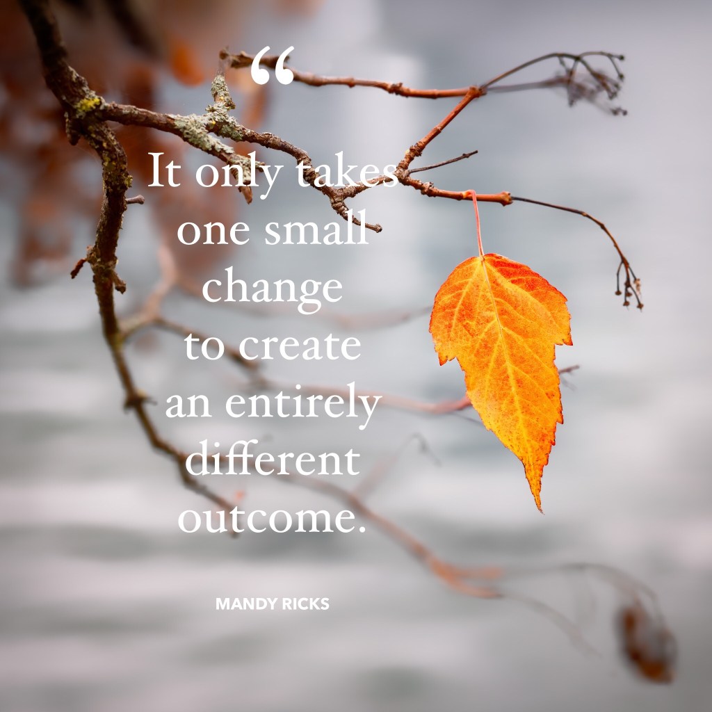 One small change On October 13, 2021October 31, 2021 By AmandaIn Quotes It only takes one small change to create an entirely different outcome. Share this: Click to share on X (Opens in new window) X Click to share on Facebook (Opens in new window) Facebook More Click to print (Opens in new window) Print Click to share on LinkedIn (Opens in new window) LinkedIn Click to share on Tumblr (Opens in new window) Tumblr Click to share on Pinterest (Opens in new window) Pinterest Click to share on Pocket (Opens in new window) Pocket Like Loading... Related