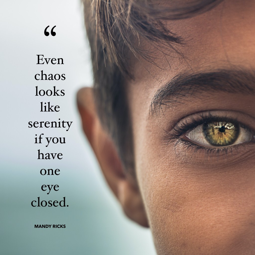 Chaotic serenity On November 3, 2021 By AmandaIn Quotes Even chaos looks like serenity if you have one eye closed. – Mandy Ricks Share this: Click to share on X (Opens in new window) X Click to share on Facebook (Opens in new window) Facebook More Click to print (Opens in new window) Print Click to share on LinkedIn (Opens in new window) LinkedIn Click to share on Tumblr (Opens in new window) Tumblr Click to share on Pinterest (Opens in new window) Pinterest Click to share on Pocket (Opens in new window) Pocket Like Loading... Related
