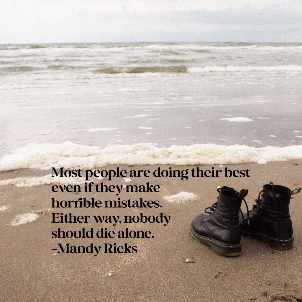No one should die alone On April 9, 2022April 10, 2022 By AmandaIn Quotes Most people are doing their best even if they make horrible mistakes. Either way, no one should die alone. – Mandy Ricks Share this: Click to share on X (Opens in new window) X Click to share on Facebook (Opens in new window) Facebook More Click to print (Opens in new window) Print Click to share on LinkedIn (Opens in new window) LinkedIn Click to share on Tumblr (Opens in new window) Tumblr Click to share on Pinterest (Opens in new window) Pinterest Click to share on Pocket (Opens in new window) Pocket Like Loading... Related