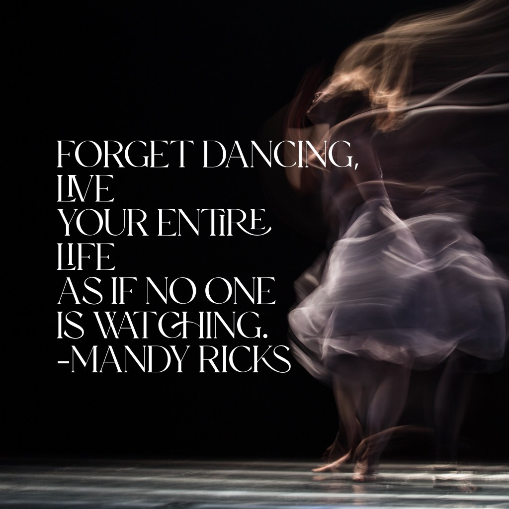 Live your life On May 28, 2022 By AmandaIn Quotes Forget dancing, live your entire life as if no one is watching. -Mandy Ricks Share this: Click to share on X (Opens in new window) X Click to share on Facebook (Opens in new window) Facebook More Click to print (Opens in new window) Print Click to share on LinkedIn (Opens in new window) LinkedIn Click to share on Tumblr (Opens in new window) Tumblr Click to share on Pinterest (Opens in new window) Pinterest Click to share on Pocket (Opens in new window) Pocket Like Loading... Related