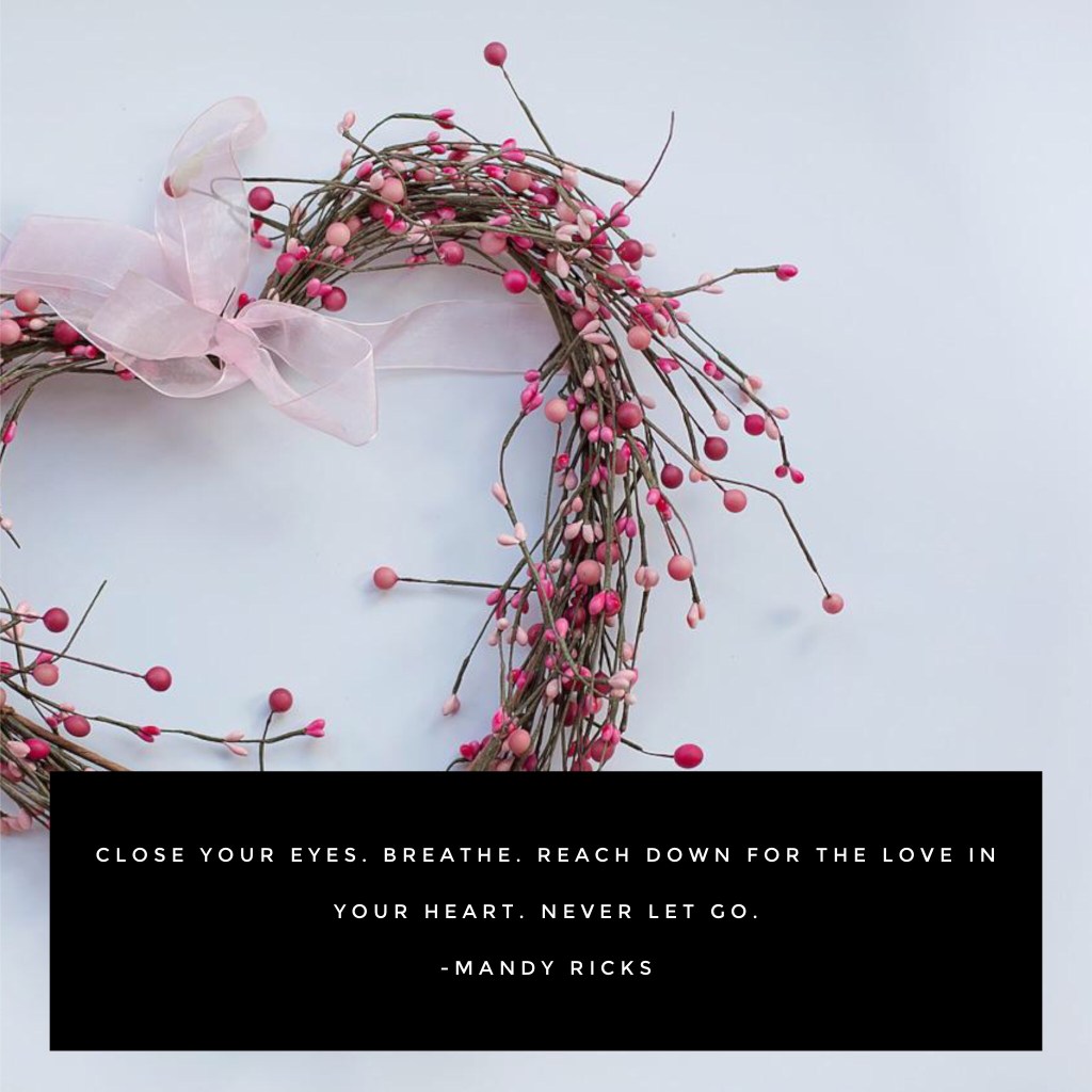 Never let go On June 7, 2022 By AmandaIn Quotes Close your eyes. Breathe. Reach down for the love in your heart. Never let go. -Mandy Ricks Share this: Click to share on X (Opens in new window) X Click to share on Facebook (Opens in new window) Facebook More Click to print (Opens in new window) Print Click to share on LinkedIn (Opens in new window) LinkedIn Click to share on Tumblr (Opens in new window) Tumblr Click to share on Pinterest (Opens in new window) Pinterest Click to share on Pocket (Opens in new window) Pocket Like Loading... Related