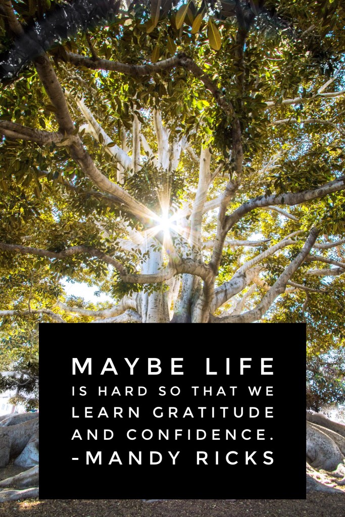 Learning gratitude On August 2, 2022 By AmandaIn Quotes Maybe life is hard so that we learn gratitude and confidence. – Mandy Ricks Share this: Click to share on X (Opens in new window) X Click to share on Facebook (Opens in new window) Facebook More Click to print (Opens in new window) Print Click to share on LinkedIn (Opens in new window) LinkedIn Click to share on Tumblr (Opens in new window) Tumblr Click to share on Pinterest (Opens in new window) Pinterest Click to share on Pocket (Opens in new window) Pocket Like Loading... Related
