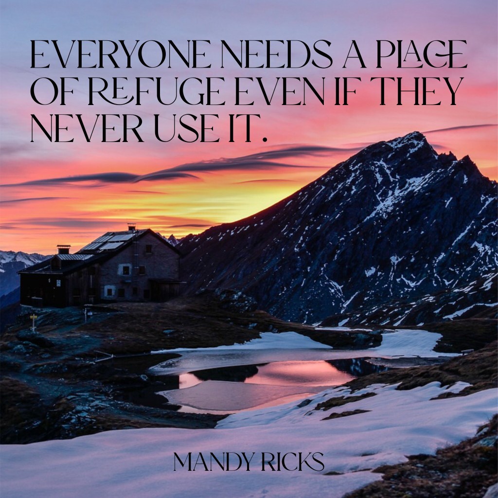 Refuge On October 25, 2022October 25, 2022 By AmandaIn Quotes Everyone needs a place of refuge even if they never use it. -Mandy Ricks Share this: Click to share on X (Opens in new window) X Click to share on Facebook (Opens in new window) Facebook More Click to print (Opens in new window) Print Click to share on LinkedIn (Opens in new window) LinkedIn Click to share on Tumblr (Opens in new window) Tumblr Click to share on Pinterest (Opens in new window) Pinterest Click to share on Pocket (Opens in new window) Pocket Like Loading... Related