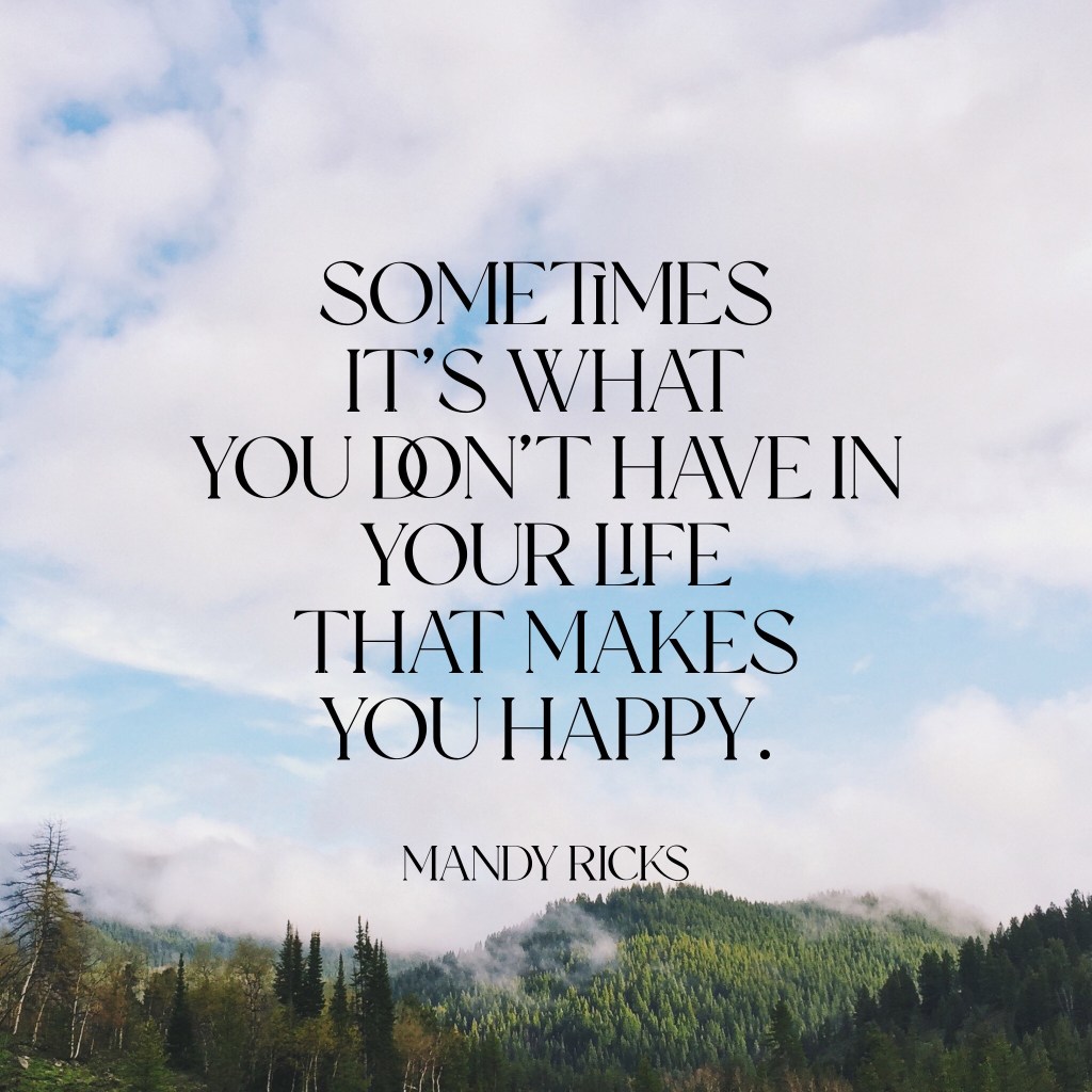 Sometimes it’s what you don’t have On December 15, 2022 By AmandaIn Quotes Sometimes it’s what you don’t have in your life that makes you happy. -Mandy Ricks Share this: Click to share on X (Opens in new window) X Click to share on Facebook (Opens in new window) Facebook More Click to print (Opens in new window) Print Click to share on LinkedIn (Opens in new window) LinkedIn Click to share on Tumblr (Opens in new window) Tumblr Click to share on Pinterest (Opens in new window) Pinterest Click to share on Pocket (Opens in new window) Pocket Like Loading... Related