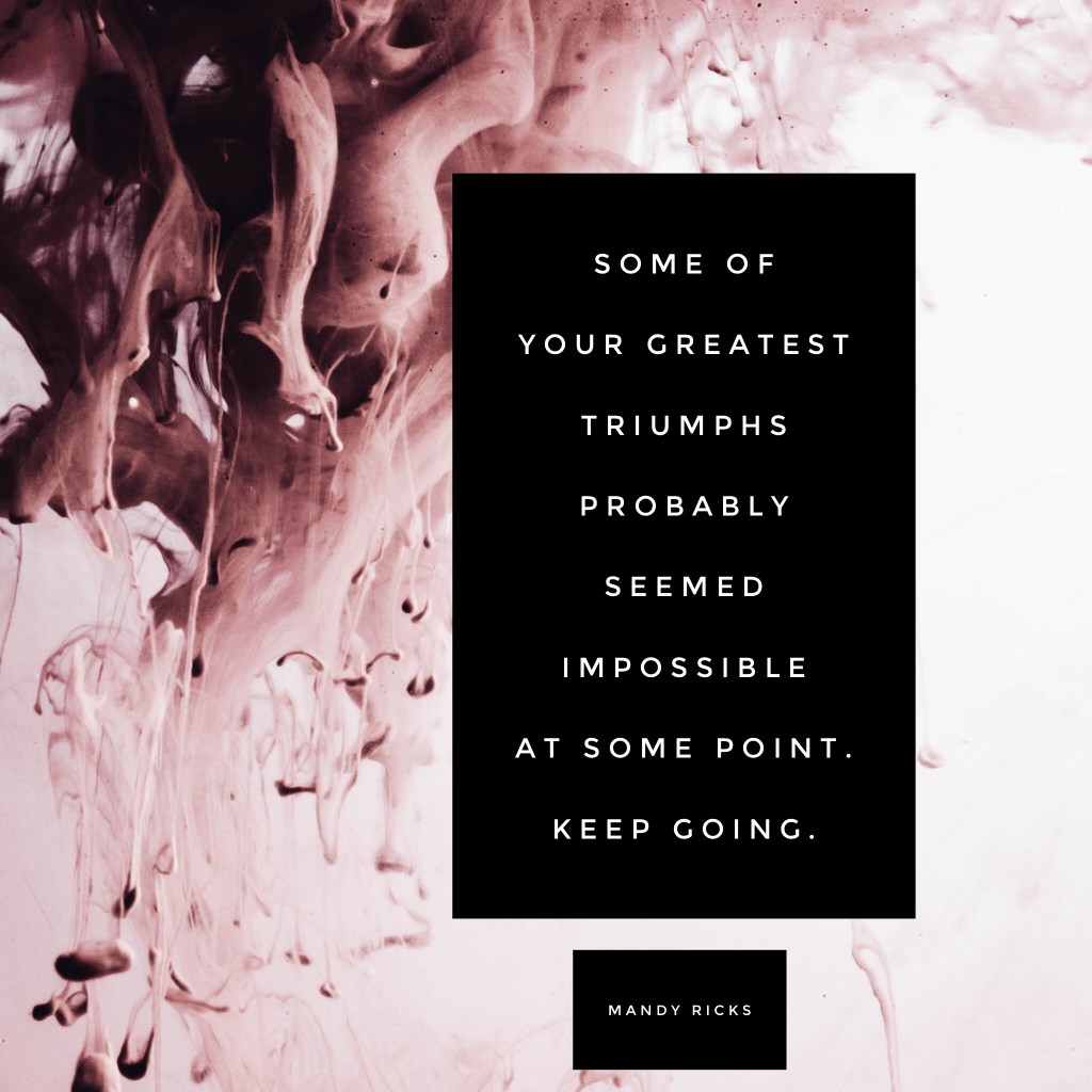 Keep going On February 11, 2023 By AmandaIn Quotes Some of your greatest triumphs probably seemed impossible at some point. Keep going. -Mandy Ricks Share this: Click to share on X (Opens in new window) X Click to share on Facebook (Opens in new window) Facebook More Click to print (Opens in new window) Print Click to share on LinkedIn (Opens in new window) LinkedIn Click to share on Tumblr (Opens in new window) Tumblr Click to share on Pinterest (Opens in new window) Pinterest Click to share on Pocket (Opens in new window) Pocket Like Loading... Related