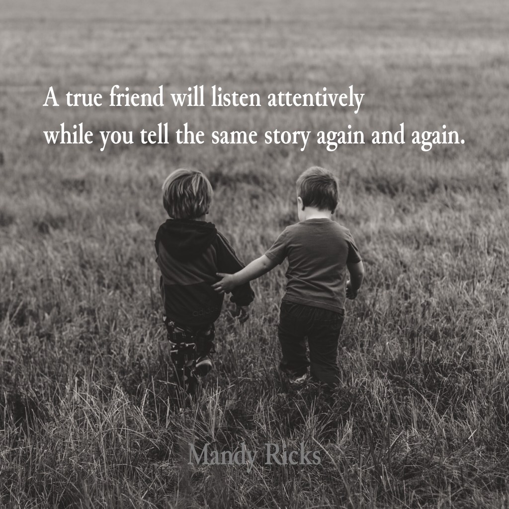 A true friend On May 13, 2023 By AmandaIn Quotes A true friend will listen attentively while you tell the same story again and again. -Mandy Ricks Share this: Click to share on X (Opens in new window) X Click to share on Facebook (Opens in new window) Facebook More Click to print (Opens in new window) Print Click to share on LinkedIn (Opens in new window) LinkedIn Click to share on Tumblr (Opens in new window) Tumblr Click to share on Pinterest (Opens in new window) Pinterest Click to share on Pocket (Opens in new window) Pocket Like Loading... Related
