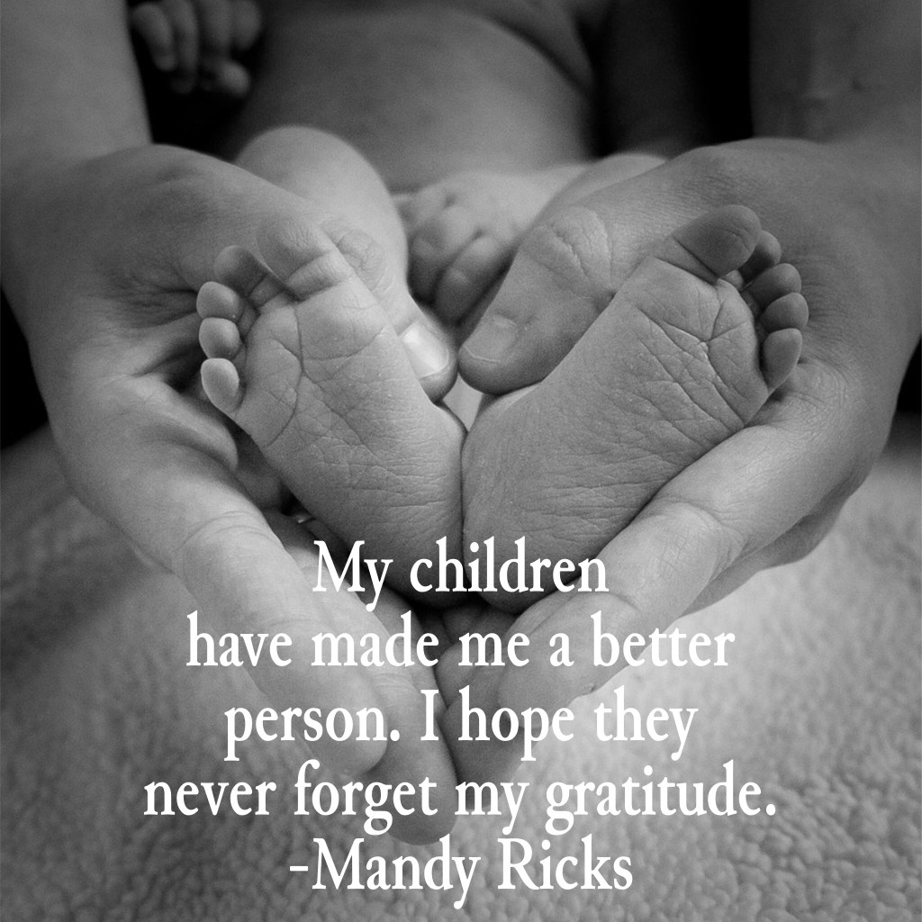 A better person On May 14, 2023 By AmandaIn Quotes My children have made me a better person. I hope they never forget my gratitude. -Mandy Ricks Share this: Click to share on X (Opens in new window) X Click to share on Facebook (Opens in new window) Facebook More Click to print (Opens in new window) Print Click to share on LinkedIn (Opens in new window) LinkedIn Click to share on Tumblr (Opens in new window) Tumblr Click to share on Pinterest (Opens in new window) Pinterest Click to share on Pocket (Opens in new window) Pocket Like Loading... Related