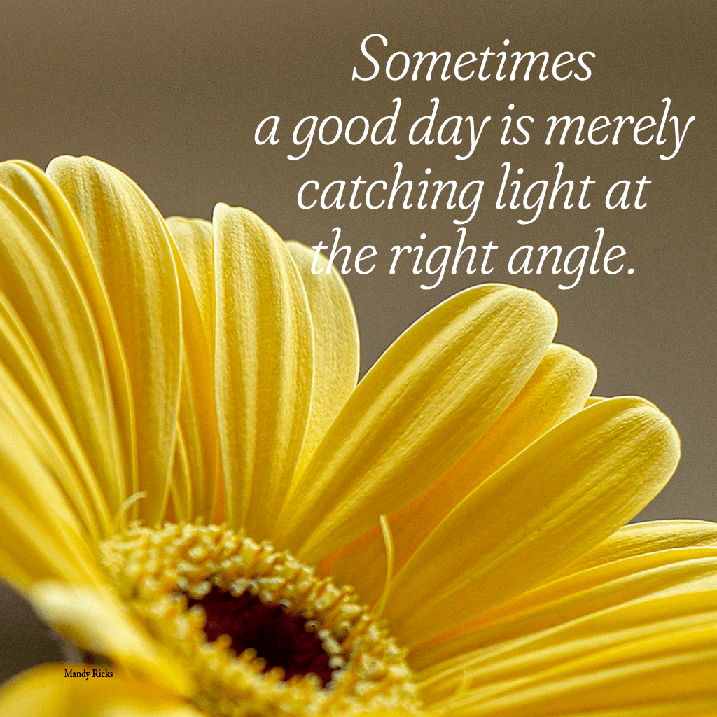 Catching light On February 26, 2026February 26, 2026 By AmandaIn Quotes Sometimes a good day is merely catching light at the right angle. -Mandy Ricks Share this: Share on X (Opens in new window) X Share on Facebook (Opens in new window) Facebook More Print (Opens in new window) Print Share on LinkedIn (Opens in new window) LinkedIn Share on Tumblr (Opens in new window) Tumblr Share on Pinterest (Opens in new window) Pinterest Like Loading... Related