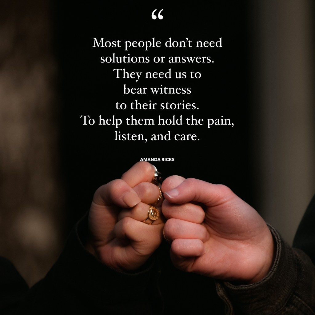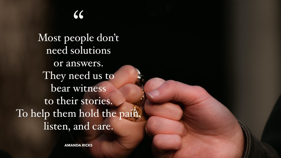 “Most people don’t need solutions or answers. They need us to bear witness to their stories. To help them hold the pain, listen, and care.” – Amanda Ricks