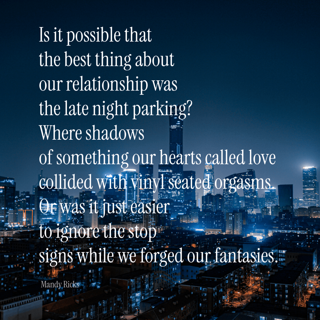 Is it possible that the best thing about our relationship was the late night parking? Where shadows of something our hearts called love collided with vinyl seated orgasms. Or was it just easier to ignore the stop signs while we forged our fantasies. -Mandy Ricks